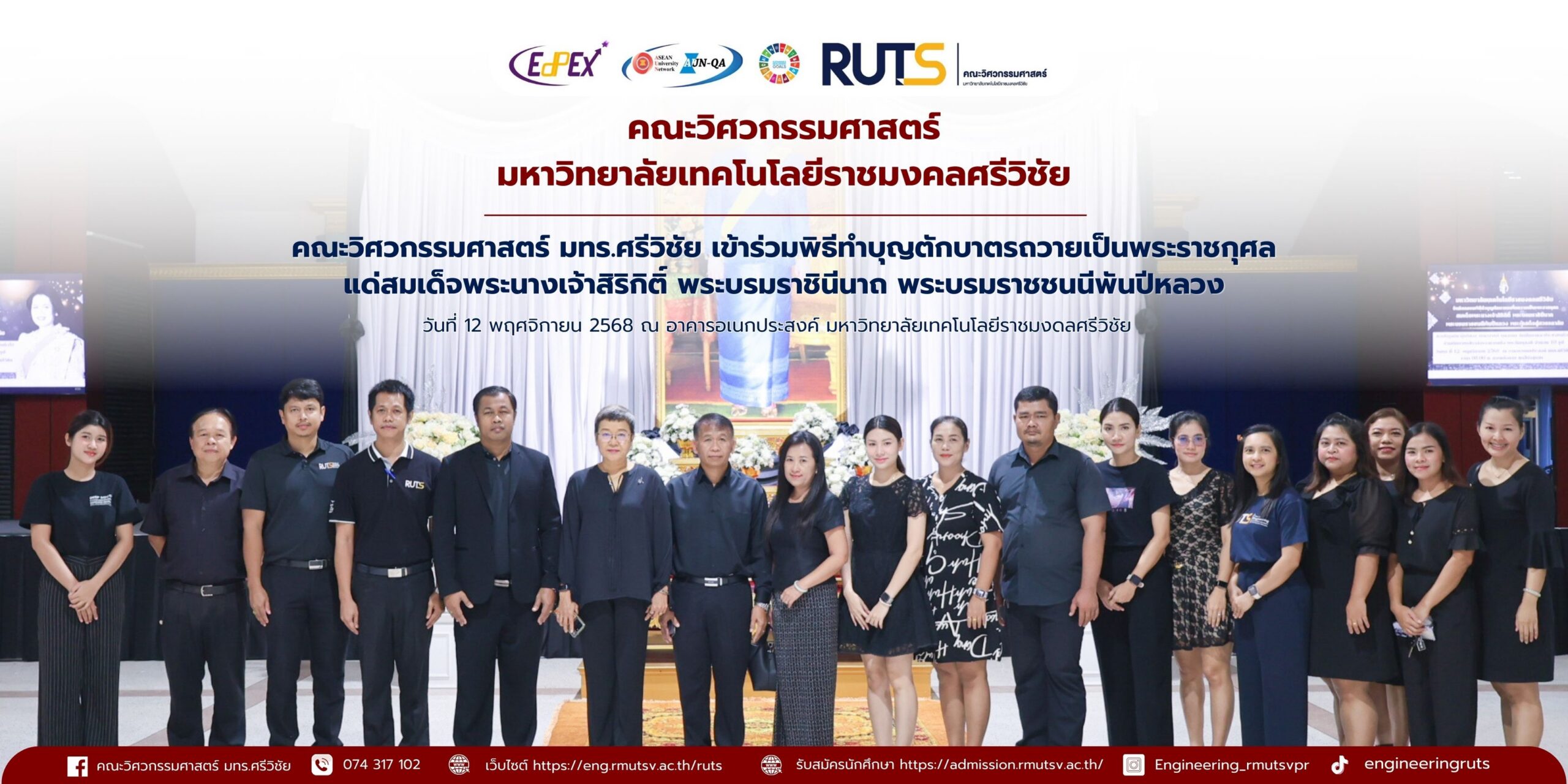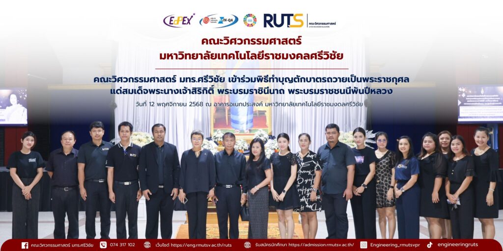 วันที่ ๑๒ พฤศจิกายน ๒๕๖๘ คณะวิศวกรรมศาสตร์ มหาวิทยาลัยเทคโนโลยีราชมงคลศรีวิชัย นำโดยผู้บริหาร คณาจารย์ และบุคลากร เข้าร่วมพิธีทำบุญตักบาตรถวายเป็นพระราชกุศลแด่ สมเด็จพระนางเจ้าสิริกิติ์ พระบรมราชินีนาถ พระบรมราชชนนีพันปีหลวง ณ อาคารอเนกประสงค์ มหาวิทยาลัยเทคโนโลยีราชมงคลศรีวิชัย จังหวัดสงขลา เพื่อแสดงความจงรักภักดีและสำนึกในพระมหากรุณาธิคุณอันหาที่สุดมิได้