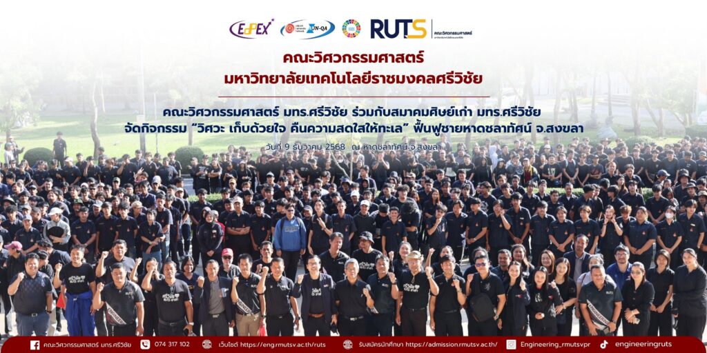 วันที่ 9 ธันวาคม 2568 คณะวิศวกรรมศาสตร์ ร่วมกับ สมาคมศิษย์เก่า มทร.ศรีวิชัย จัดกิจกรรม “วิศวะ เก็บด้วยใจ คืนความสดใสให้ทะเล” เพื่อฟื้นฟูและทำความสะอาดชายหาดชลาทัศน์ จังหวัดสงขลา โดยมี นักศึกษาคณะวิศวกรรมศาสตร์จากทั้ง 13 หลักสูตร รวมกว่า 1,500 คน เข้าร่วมกิจกรรม เดินเก็บขยะและปรับภูมิทัศน์ครอบคลุมระยะทางกว่า 5 กิโลเมตร ตลอดแนวชายหาด