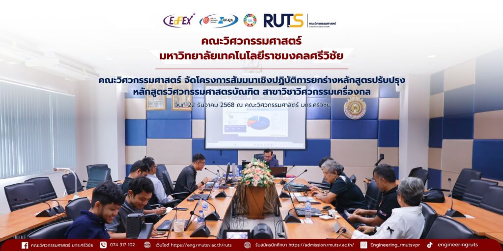 วันจันทร์ที่ 22 ธันวาคม 2568 คณะวิศวกรรมศาสตร์ มทร.ศรีวิชัย จัดโครงการสัมมนาเชิงปฏิบัติการการยกร่างหลักสูตรปรับปรุง หลักสูตรวิศวกรรมศาสตรบัณฑิต สาขาวิชาวิศวกรรมเครื่องกล ณ ห้องเฟืองทอง และผ่านระบบออนไลน์ โดยมีคณาจารย์และผู้ทรงคุณวุฒิเข้าร่วม