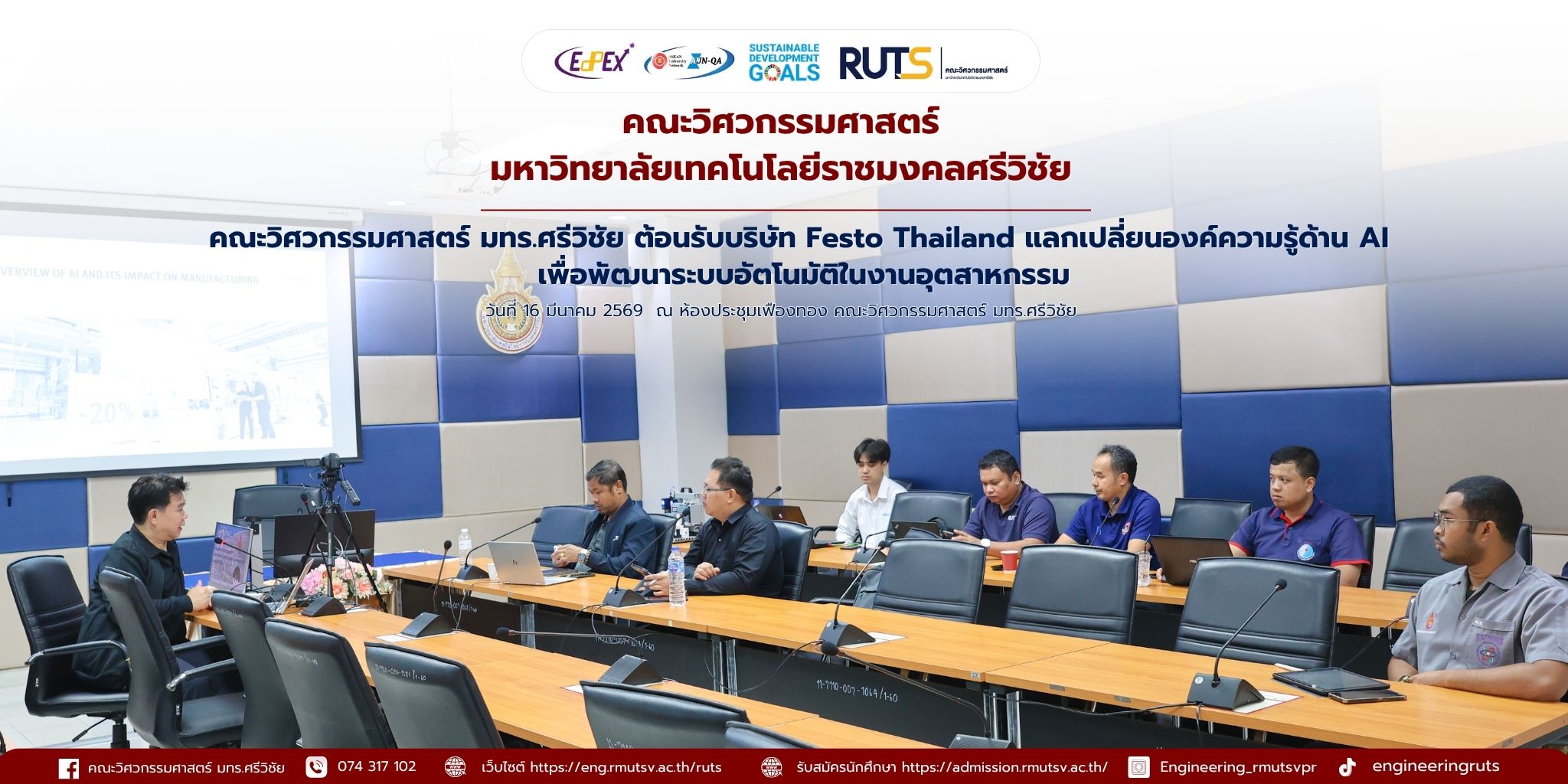 วันที่ 16 มีนาคม 2569 คณะวิศวกรรมศาสตร์ มหาวิทยาลัยเทคโนโลยีราชมงคลศรีวิชัย ให้การต้อนรับผู้แทนจากบริษัท Festo Thailand บริษัทชั้นนำด้านเทคโนโลยีระบบอัตโนมัติและอุปกรณ์ระบบนิวเมติกส์ (Pneumatic) จากสหพันธ์สาธารณรัฐเยอรมนี ซึ่งเข้าพบคณะผู้บริหารและคณาจารย์ของคณะวิศวกรรมศาสตร์ เพื่อแนะนำแนวทางการพัฒนาเทคโนโลยีและความร่วมมือกับภาคการศึกษา