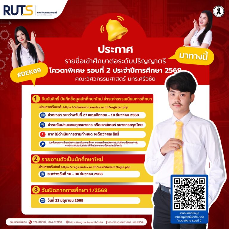 ข่าวประชาสัมพันธ์ ประกาศรายชื่อผู้มีสิทธิ์เข้าศึกษาต่อโควตาพิเศษ รอบที่ 2 ประจำปีการศึกษา 2569 คณะวิศวกรรมศาสตร์ มทร.ศรีวิชัยพฤศจิกายน 20, 2025พฤศจิกายน 20, 2025